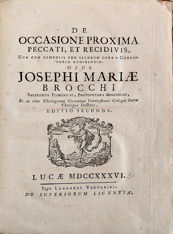 De occasione proxima peccati et recidivis, una cum remediis pro illorum cura a Confessario adhibendis. Opus Josephi Mariae Brocchi (...)