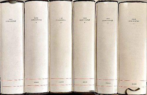 Storia Naturale. I:Cosmologia e Geografia,libri 1-6,pp.LXXIV-848, 14 tavv.a col.ft. II:Antropologia e Zoologia,libri 7-11,pp.710, 14 tavv.a col.ft. III.1:Botanica,libri 12-19,pp.1000, 15 tavv.a col.ft. III.2:Botanica,libri 20-27,pp.912. IV:Medicina e Farmacologia,libri 28-32,pp.646, 8 tavv.a col.ft. V:Mineralogia e Storia dell'arte,libri 33-37,pp.970, 11 tavv.ft.
