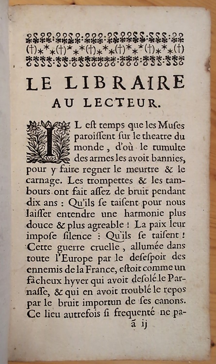 AbstractPrima edizione di questo poema licenzioso con alcuni passaggi osceni soprattutto nell’episodio del tentativo di seduzione di Putiphar nei confronti di Giuseppe. Nella lunga ricerca di rintracciare varianti all’interno della princeps del 1679 (inesistente, a quanto sembra, una edizione del 1678 che, se esistita veramente, sarebbe solo una variazione di anno come accade di frequente nell’editoria antica per far vedere che il prodotto viene venduto) si è cercato di distinguere due tirature, che sono state considerate addirittura due edizioni differenti, in base al pregiudizio che l’autore, un monaco piuttosto autorevole, abbia ricevuto rampogne per certune oscenità del libro, ma di questo, a quanto risulta non esiste prova alcuna. Verisimilmente si è cercato di ipotizzare il solito meccanismo che i bibliofili utilizzano per garantire la rarità di un libro che poteva in qualche modo creare scandalo. In realtà le due varianti, all’interno della prima edizione, riguardano soltanto la correzione di refusi tipografici, verisimilmente da parte dell’autore, come accadeva regolarmente, dato che i passi osceni rimangono inalterati. In tale chiave è da spiegare anche lo scivolamento a pagina 93 del verso che nella prima variante sarebbe stato stampato a fine pagina 92. Anche la questione del fleuron nel frontespizio, non ho potuto in rete reperire fleuron diversi negli esemplari che ho confrontato. Purtroppo non sono riuscito a confrontare l’esemplare qui presente con uno presunto della prima variante. Libro non raro ma molto curioso. Cioranescu, 50522; Gay-Lemonnyer, II, 728; Brunet, V, 1095; Taschereau, 1527; Laporte, Bibliographie clérico-galante, 128.?.