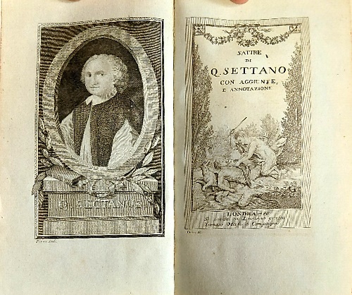 AbstractDedica dell'editore a Carlo Teodoro conte Palatino. Queste 17 satire ed il curioso componimento poetico in terza rima ''La conversazione delle dame di Roma, dialogo fra Pasquino , e Marforio'', pubblicate in latino sotto lo pseudonimo di Quinto Settano (1694, probabilmente a Napoli), ebbero larga diffusione all'epoca e procurarono all'autore la fama di mordace castigatore di vizi di prelati, dame e scrittori dell'epoca. Precede la Vita del Sergardi scritta da anonimo.