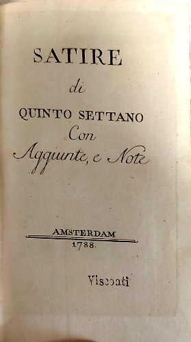 Details cm.9,5x16, p.XXV, [1], 353, [3]. legatura in tutta pergamena rigida, tassello in pelle al dorso. I tre tagli sono colorati di rosso. Satire originariamente composte in latino.