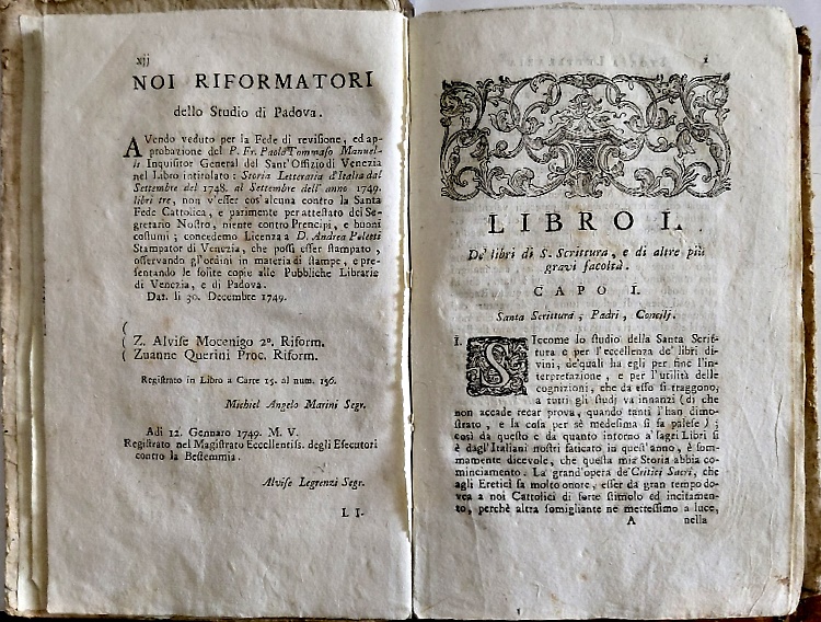 Storia letteraria d' Italia. divisa in tre libri, il primo, e secondo de' quali trattano de' migliori libri usciti in Italia dal settembre 1748. fino al settembre 1749. Contiene il terzo importanti notizie di scuole introdotte, di musei, di osservazioni matematiche, di nuovi ritrovati, di scoperte anticaglie, di uomini illustri trapassati, e delle gesta loro.