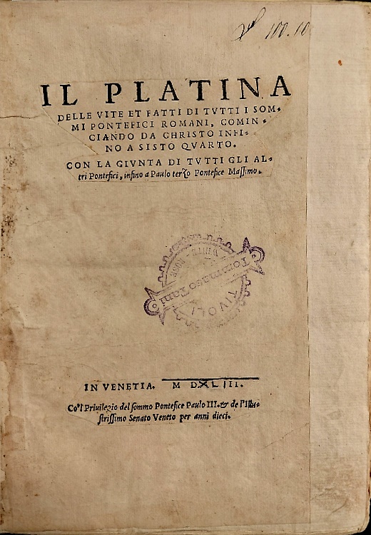 Il Platina Delle vite et fatti di tutti i sommi pontefici romani, cominciando da Christo infino a Sisto Quarto. Con la giunta di tutti gli altri Pontefici, infino a Paulo terzo Pontefice Massimo.