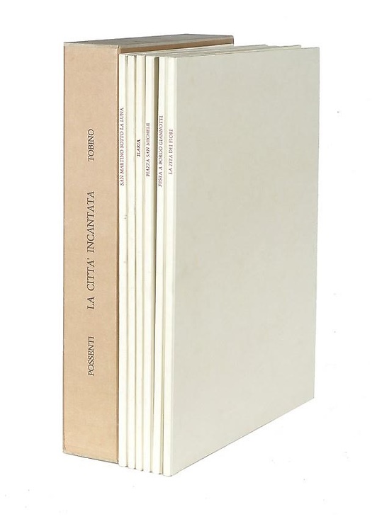 ✱ i fogli bianchi e la cartella presentano ognuno una macchia di umidità con la medesima forma, mentre le tre serigrafie sono in ottimo stato di conservazione e non presentano macchie.