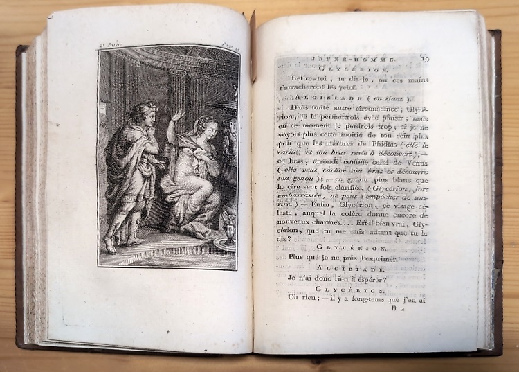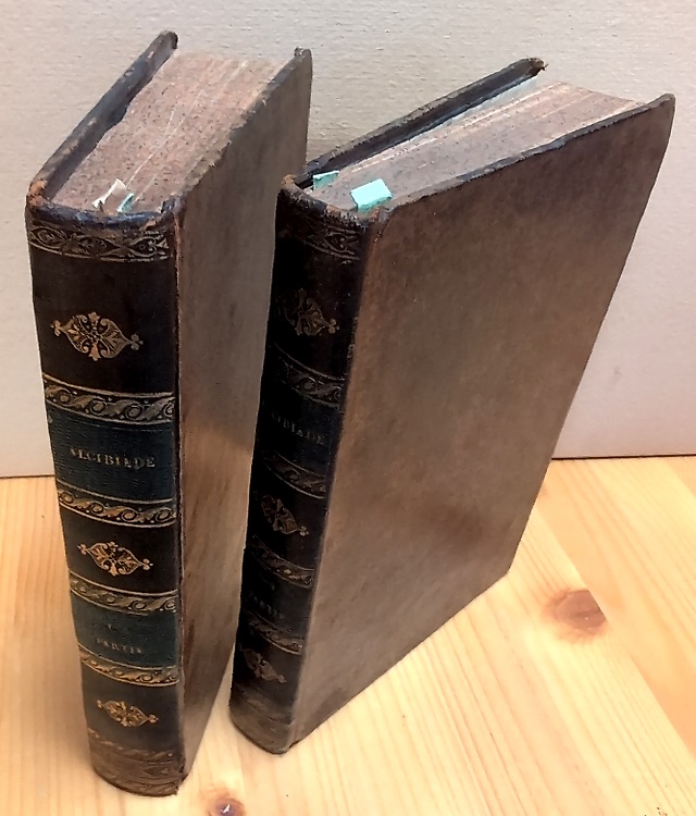 Abstractdue tomi. I; Alcibiade, jeune-homme; una carta bianca, 12 pagine numerate romane, 248 pagine numerate arabe, una carta non numerata. II; Alcibiade, jeune homme; 2 carte non numerate, pagine 264 numerate arabe, 2 carte non numerate. III; Alcibiade, homme fait; 3 carte non numerate, 224 pagine numerate, una carta non numerata. IV; Alcibiade, vieillard; 2 carte non numerate, pagine numerate 270. Belle legature coeve in piena pelle marrone, dorsi lisci in pelle verde con riquadri, fregi e titolo in oro, Tagli spruzzati. Ogni volume presenta una incisione a piena pagina di gusto neoclassico-romantico, in questo esemplare protette dalle veline originali. Splendida copia, legatura con solo una cerniera del primo tomo lievemente consunta. Si tratta di una traduzione fortemente rielaborata dell’omonimo romanzo di August Gottlieb Meissner(1753-1807), che è stata attribuita a Rauquil-Lieutaud, con la revisione di Pierre-Bernard Lamare, anche se l’adattamento è stato attribuito anche a Louis-Sébastien Mercier o a Jean-Baptiste-Claude Delisle de Sales. Secondo l’erudito e bibliografo Paul Lacroix, nel Catalogue de livres... provenant de la bibliothèque de M. de N***..., Paris, 1856, da lui redatto, al numero 218 si afferma che: “Delisle de Sales est l'auteur de cet ouvrage où il n'y a rien de Meissner” rivalutando quindi l’originalità del prodotto francese. Une autre adaptation, due à Perrin de Cayla, de l'ouvrage de Meissner a paru sous le titre : "Les Quatre ages d'Alcibiade...", in : "Bibliothèque universelle des romans", Paris, avril 1788. Seconda edizione, la prima è del 1789, ma dello stesso editore. Si può supporre che sia una rimessa in vendita del non venduto della tiratura del 1789. Questa sorta di romanzo che al contempo ha anche i risvolti di una biografia erudita, si inquadra nel gusto antiquario del 700, ed in particolare nella predilezione per biografie eccentriche che potevano rientrare facilmente anche nel filone del romanzo libertino, come è il caso della figura di Alcibiade, il campione della spregiudicatezza libertina dell’antica Atene.