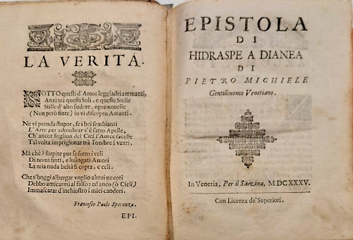 Dettagli cm.15,5x21, (16) carte non numerate, pp.326,(2), Frontespizio in cornice a doppio filetto, marca editoriale incisa al frontespizio. Marca "donna coronata seduta su leone su lembo terra in mezzo mare tiene scettro e con sinistra getta in mare anello. Cornice. Motto: Potens ubique merito. Segue dedica a Dominico Da Molino; Lo stampatore a chi legge; La verità, sonetto di Francesco Paolo Speranza; dopo queste carte preliminari segue: Epistola di Hidraspe a Diana di Pietro Michiele gentilhuomo venetiano (1635). legatura coeva cartonata, titoli al dorso.