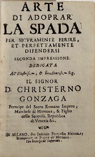 Dettagli cm.11x17,5, pp.(8), 170, occhietto con incisione e titolo, capilettera incisi e finalini con fregi xilografici. rilegatura cartonata fasciata in carta marmorizzata. All'antiporta un ex libris applicato, celebre per provenienza, appartenente alla "Raccolta di scherma di Jacopo Gelli" con motto Fa che tu non faci a me quelo che tu non voi per Te” - “Chi altri caza per se non possa” .