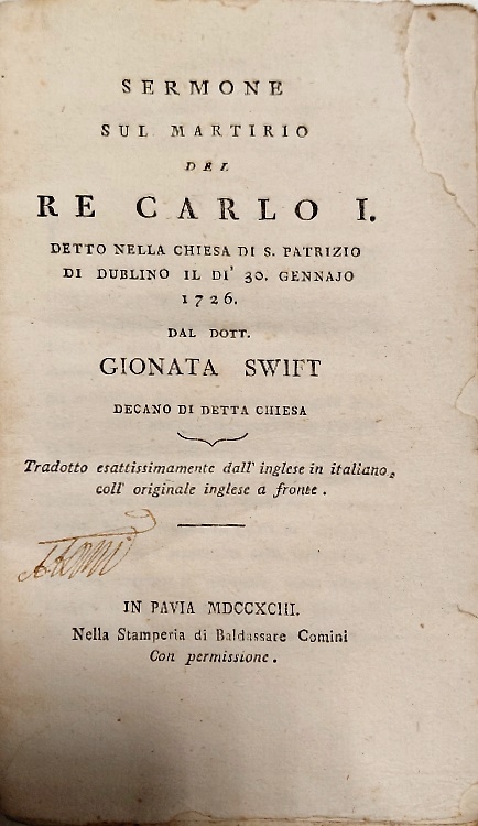Sermone sul martirio del Re Carlo I. detto nella chiesa di S. Patrizio di Dublino il dì 30 gennajo 1726& Tradotto esattissimamente dall'inglese in italiano coll'originale a fronte.