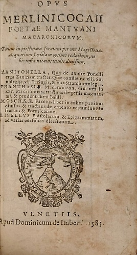 Opus Merlini Cocaii poetae mantuani macaronicorum Totum in pristinam formam per me Magistrum Acquarium Lodolam optime redactum, in his infra notatus titulis divisum Zanitonella, Phanthasiae, Moschaeae, Libellus.