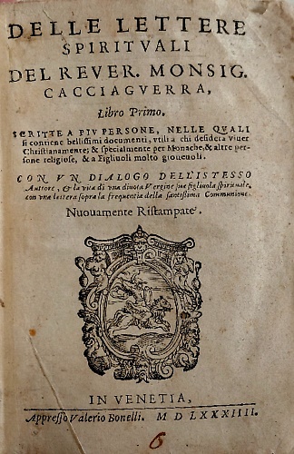 Delle lettere spirituali del Rever. Monsig. Cacciaguerra scritte a più persone: libro primo e libro secondo 1: Delle lettere spirituali del reuer. monsig. Cacciaguerra, libro primo [-2]. ... Con un dialogo dell'istesso auttore, & la vita di vna diuota vergine sua figliuola spirituale, con una lettera sopra la frequentia della santissima communione,2:Delle lettere spirituali del reuerendo Bonsignore Cacciaguerra, libro 2. scritte a più persone sopra diuersi soggetti molto vtili, nuouamente ristampato ...