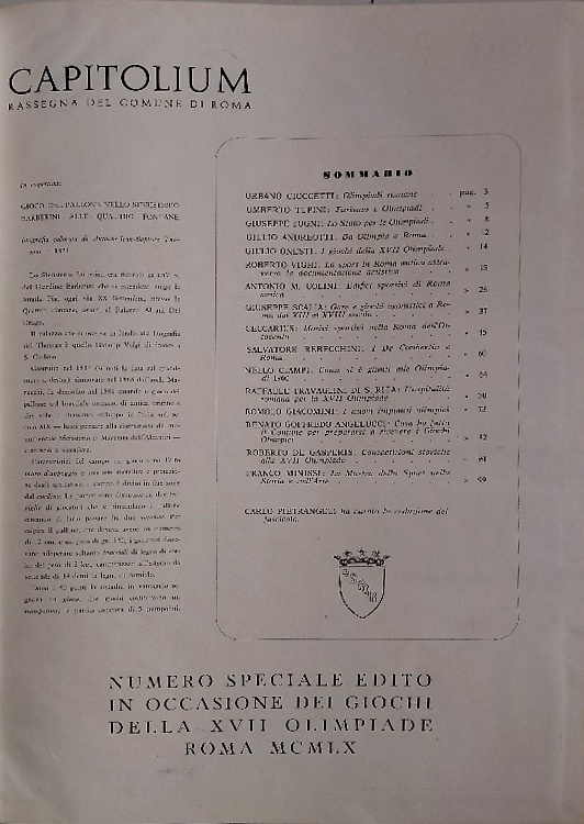 Numero speciale edito in Occasione dei giochi della XVII Olimpiade. Roma MCMLX. Rilegato insieme a :Olympiad 1960. Games of the XVIII Olympiad , Rome 1960. Edited by the italian State Tourust Department.