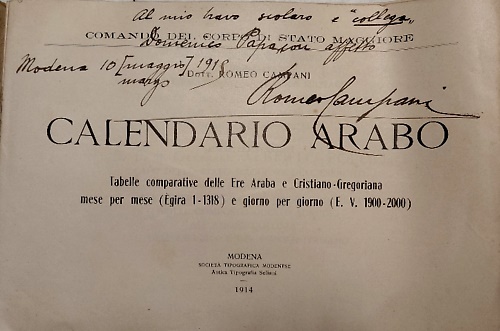 Calendario arabo. Tabelle comparative delle Ere Araba e Cristiano-Gregoriana mese per mese (Egira 1-1318) e giorno per giorno (E. V. 1900-2000).