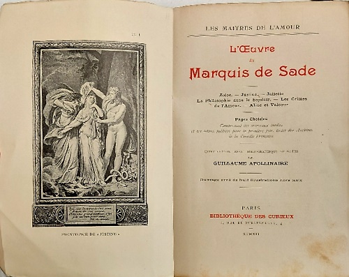 L oeuvre du Marquis de Sade. Zoloé, Justine, Juliette, La Philosophie dans le boudoir, Les crimes de l Amour, Aline et Valcour. Pages choisies, comprenant des morceaux inédits et des lettres publiées pour la première fois, tirées des Archives de la Comédie-Française. Introduction, essai bibliographique et notes par Guillaume Apollinaire.