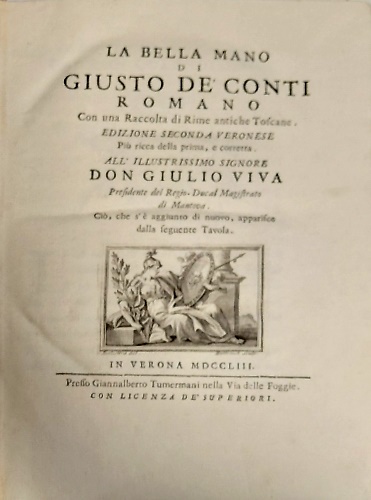 La Bella Mano di Giusto de' Conti Romano con una raccolta di Rime antiche Toscane Edizione Seconda Veronese più ricca della prima, e corretta. All'Illustrissimo Signore Don Giulio Viva, Presidente del Regio-Ducal Magistrato di Mantova.