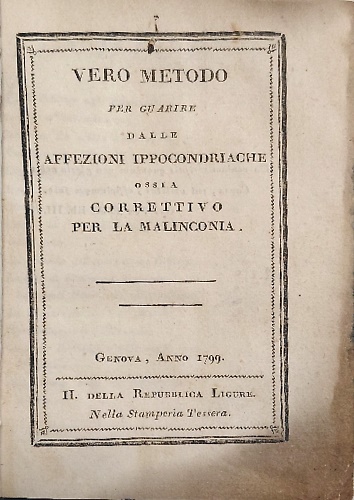 Vero metodo per guarire dalle affezioni ippocondriache, ossia Correttivo per la malinconia. Dall'indice: : L'editore agli associati, sonetto d'introduzione. Canzone: La scelta della sposa naccherata: sopra il non so che. Ditirambo: Sul vino. Epitalamio: Canzone. Ottave: Il fico ermafrodito. La critica sui costumi , ossia, la sferza del vizio. La monotonia del cuore di una civetta. Lettera di Eloisa ad Abelardo D'alessandro Pope tradotta dall'inglese. La pastorella del Cav. Marini. Ringraziamento bernesco. Capitolo bernesco: Sulla voglia delle donne. Epigramma sulle 30 bellezze delle donne. Scelta di sonetti amorosi. Scelta di sonetti giocosi. Essay de poesies een langue francaise. Avviso.