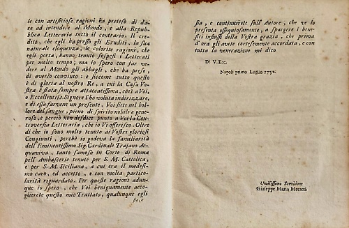 Esame o sia Confronto di ragioni addotte dall'autore delle Novelle letterarie di Firenze dottor Giovanni Lami da Santacroce e dall'abate Giuseppe Maria Mecatti fiorentino sopra le pretese città di Pompei e d'Ercolano, sopra la Rettina, o sia Resina di cui parla Plinio, e sopra le scavazioni, che presentemente si fanno alla real Villa di Portici da sua maestà siciliana.