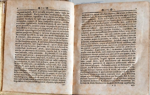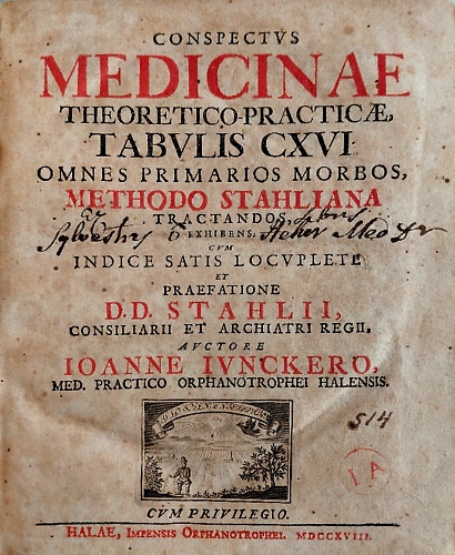 Conspectus medicinae theoretico-practicae, tabulis CXVI omnes primarios morbos, methodo Stahliana tractandos, exhibens: cum indice satis locuplete et praefatione D.D. Stahlii. Bella marca tipografica animata al frontespizio con motto "Illo splendente levabor". Testatine, iniziali e finalini animati e riccamente ornati.