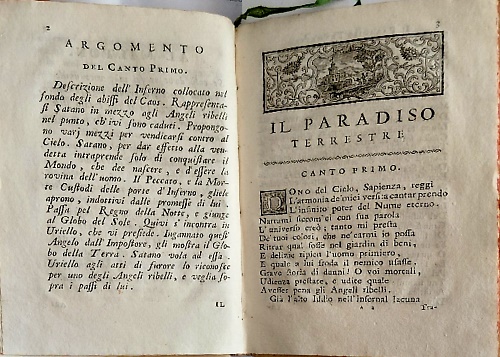 Dettagli cm.13x19, in-8, pp.[16], 111, [1], Sul frontespizio un raffinata vignetta calcografica con la caduta degli angeli ribelli dal dal Paradiso. Legatura in piena pergamena rigida, piccolo tassello in pelle. I tre tagli sono colorati. Edizione originale del Gozzi. Esemplare estremamente pulito.