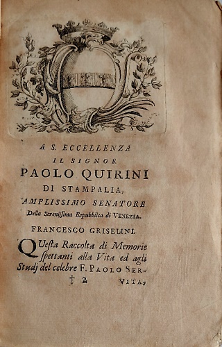 Dettagli cm.13x20,5, XXXII 296 (1) carta (di tavola in antiporta). con ritratto di Paolo Sarpi, sottoscritta: Aere incidit F. Griselini. Frontespizio stampato in rosso e nero con vignetta calcografica. Testatina con stemma calcogr. del dedicatario Paolo Querini Stampalia. Legatura in cartoncino d'attesa. Edizione con falso luogo di stampa. Esemplare chiaro e pulito.