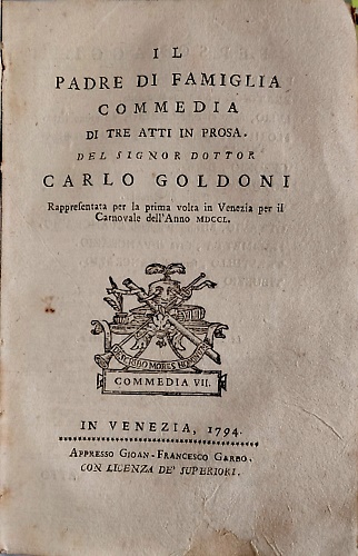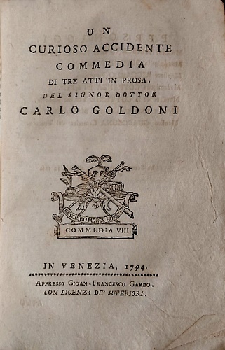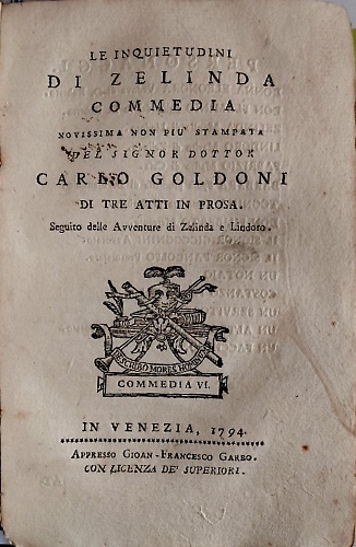 Raccolta completa di tutte le commedie in prosa, ed in verso del signor Carlo Goldoni avvocato veneziano fra gli arcadi di Roma Polisseno Fegejo. Tomo secondo delle commedie in prosa. 5. La gelosia di Lindoro. 6. L'inquietudini di Zelinda. 7. Il padre di famiglia. 8. Un curioso accidente.