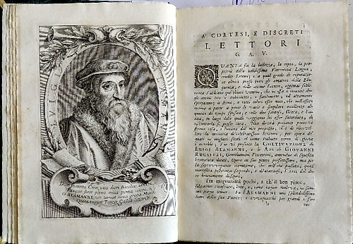 AbstractOpera che include i poemi didascalici di Luigi Alamanni e Giovanni Rucellai, rispettivamente sulla coltura dei campi e l'allevamento delle api. I due componimenti sono arricchiti dalle annotazioni di Roberto Titi e da una lettera di Giovanni Raimondo Checcozzi in difesa del Trissino. La nostra copia è inoltre arricchita dalla presenza del ritratto di Alamanni.