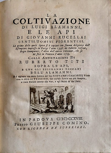 La coltivazione di Alamanni e le api di Rucellai . Colle annotazioni di Ruberto Titi sopra le api, e con gli epigrammi toscani dell'Alamanni. Si Ë aggiunta una dotta lettera del Sig. Giovanni Checozzi vicentino in difesa del Trissino, due copiose tavole non più stampate, e varie notizie alla vita.