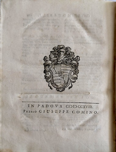 1804, 2 opere in un vol. cm.14x22,5, pp.88,324, con ritratti incisi alle antiporte di P. Caronni e G. Boggi. legatura in mezza pelle, titoli e fregi in oro al dorso. Qualche buco di tarlo e mancanza alla cerniera, ma buon esemplare e internamente molto fresco. Edizione fatta sulla Cominiana, Padova,Comino,1718.